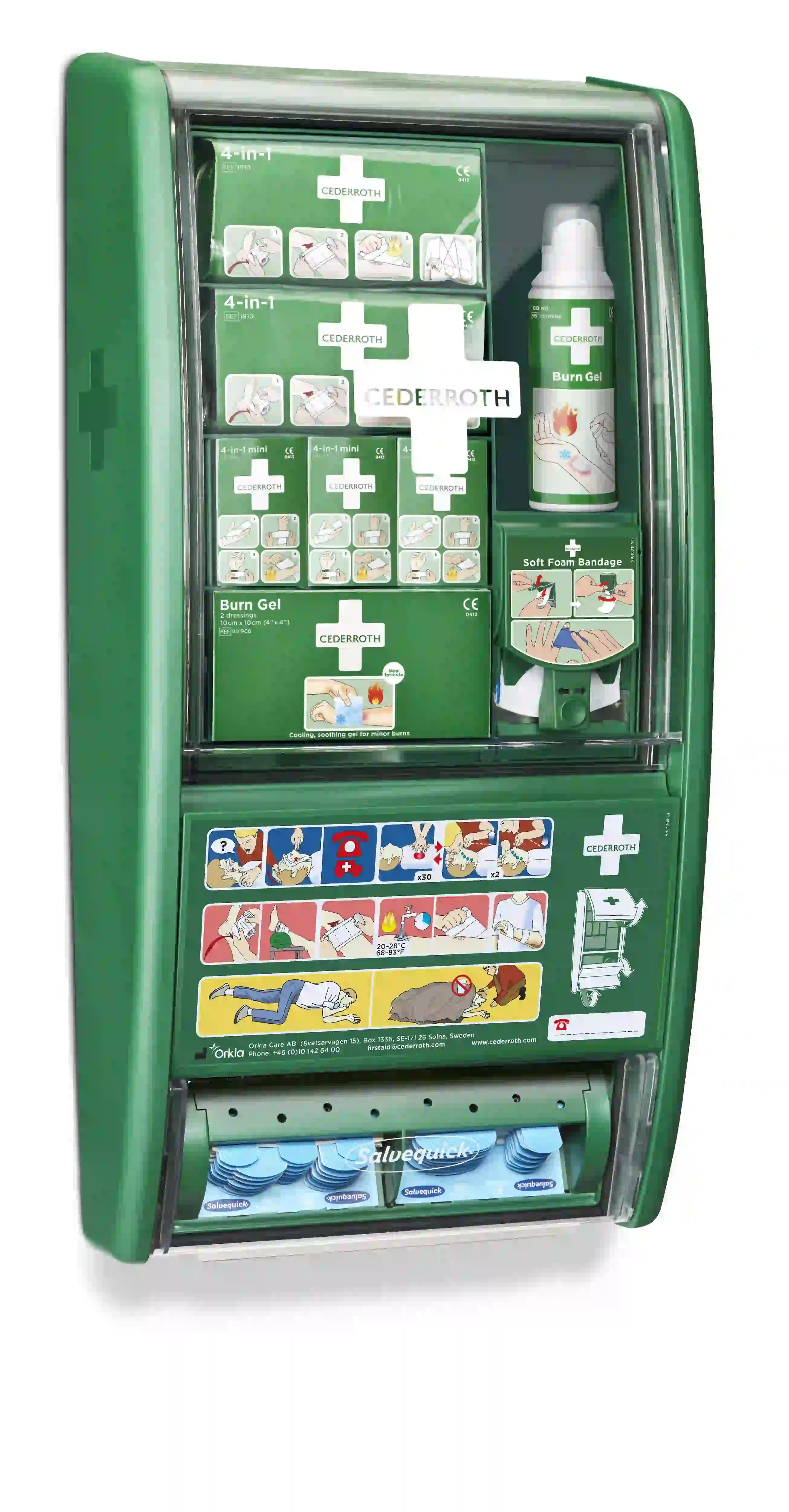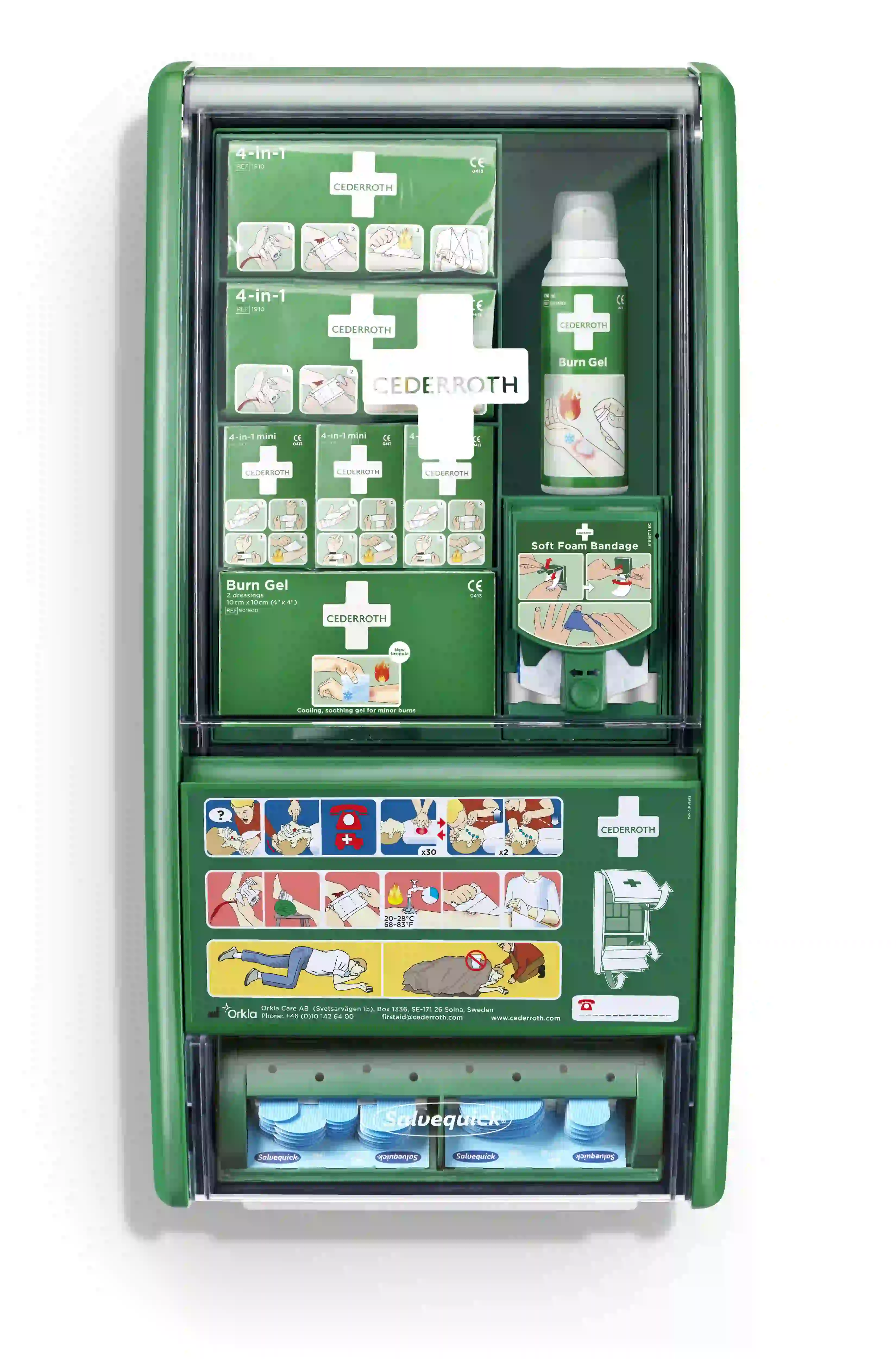 Die Erste-Hilfe-Station mit Zusatzausrüstung für Verbrennungen. Eine Erste-Hilfe-Station für alle Berufe mit hohem Risiko von Verbrennungen und Schnittverletzungen, z. B. Köche, Elektriker und Schweißer. Mit der richtigen Ausrüstung in Reichweite kann bei Unfällen schneller und wirksamer Erste Hilfe geleistet werden. Burn Cover Pflaster, das kleinere Brandwunden schützt und den Schmerz lindert. Die Wundauflage besteht aus einem kühlen Hydrogel, das die Nervenstränge der Haut abdeckt. Auf diese Weise werden der Schmerz gelindert und die Wundheilung beschleunigt. Die Wundauflage haftet nicht an der Wunde. Cederroth Burn Gel Spray und sterile Kompressen sorgen für schnelle Kühlung sowie effektive Schmerzlinderung bei Brandwunden und beschleunigen den Heilungsprozess. Die Cederroth Burn Gel Produkte sind genauso wirksam wie lauwarmes Wasser. Soft Foam Bandage Blue ist ein elastisches, selbstklebendes Pflaster, das maximale Beweglichkeit gewährt. Mit dem intelligenten Spender lassen sich Streifen einfach und passgenau abschneiden. Das Pflaster ist für alle Arten von Wunden geeignet und löst sich nicht im Wasser. Salvequick Blue Detectable Pflaster sind ideal für den Lebensmittelbereich. Die blaue Farbe sorgt für gute Sichtbarkeit. Das Pflaster wird von den meisten Metalldetektoren erkannt.