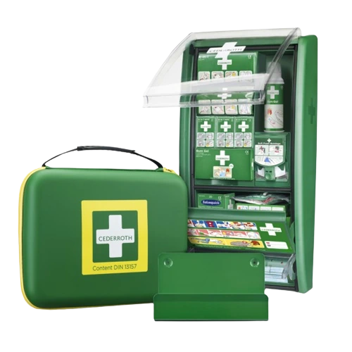 Die Erste-Hilfe-Station mit Zusatzausrüstung für Verbrennungen. Eine Erste-Hilfe-Station für alle Berufe mit hohem Risiko von Verbrennungen und Schnittverletzungen, z. B. Köche, Elektriker und Schweißer. Mit der richtigen Ausrüstung in Reichweite kann bei Unfällen schneller und wirksamer Erste Hilfe geleistet werden. Burn Cover Pflaster, das kleinere Brandwunden schützt und den Schmerz lindert. Die Wundauflage besteht aus einem kühlen Hydrogel, das die Nervenstränge der Haut abdeckt. Auf diese Weise werden der Schmerz gelindert und die Wundheilung beschleunigt. Die Wundauflage haftet nicht an der Wunde. Cederroth Burn Gel Spray und sterile Kompressen sorgen für schnelle Kühlung sowie effektive Schmerzlinderung bei Brandwunden und beschleunigen den Heilungsprozess. Die Cederroth Burn Gel Produkte sind genauso wirksam wie lauwarmes Wasser. Soft Foam Bandage Blue ist ein elastisches, selbstklebendes Pflaster, das maximale Beweglichkeit gewährt. Mit dem intelligenten Spender lassen sich Streifen einfach und passgenau abschneiden. Das Pflaster ist für alle Arten von Wunden geeignet und löst sich nicht im Wasser. Salvequick Blue Detectable Pflaster sind ideal für den Lebensmittelbereich. Die blaue Farbe sorgt für gute Sichtbarkeit. Das Pflaster wird von den meisten Metalldetektoren erkannt.