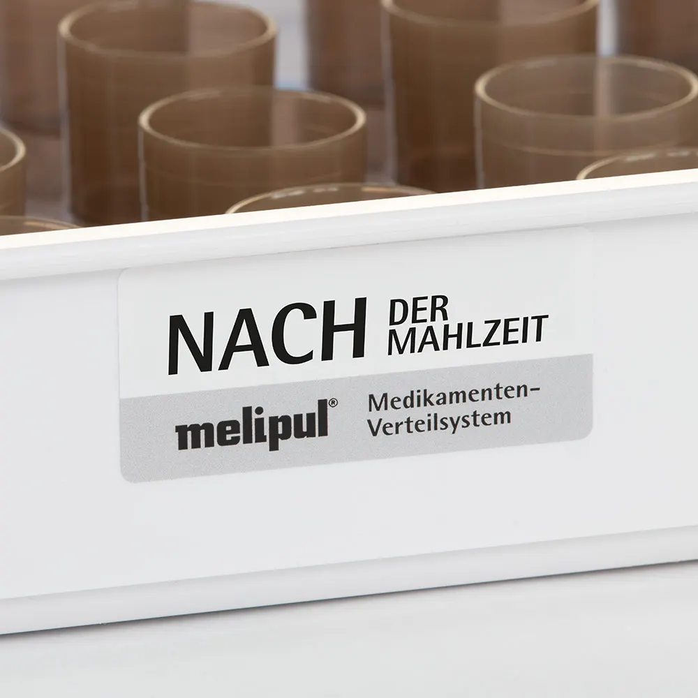 Aufkleber zur Tablettkennzeichnung der Medikation mit der Aufschrift TROPFEN VOR der Mahlzeit und NACH der Mahlzeit.