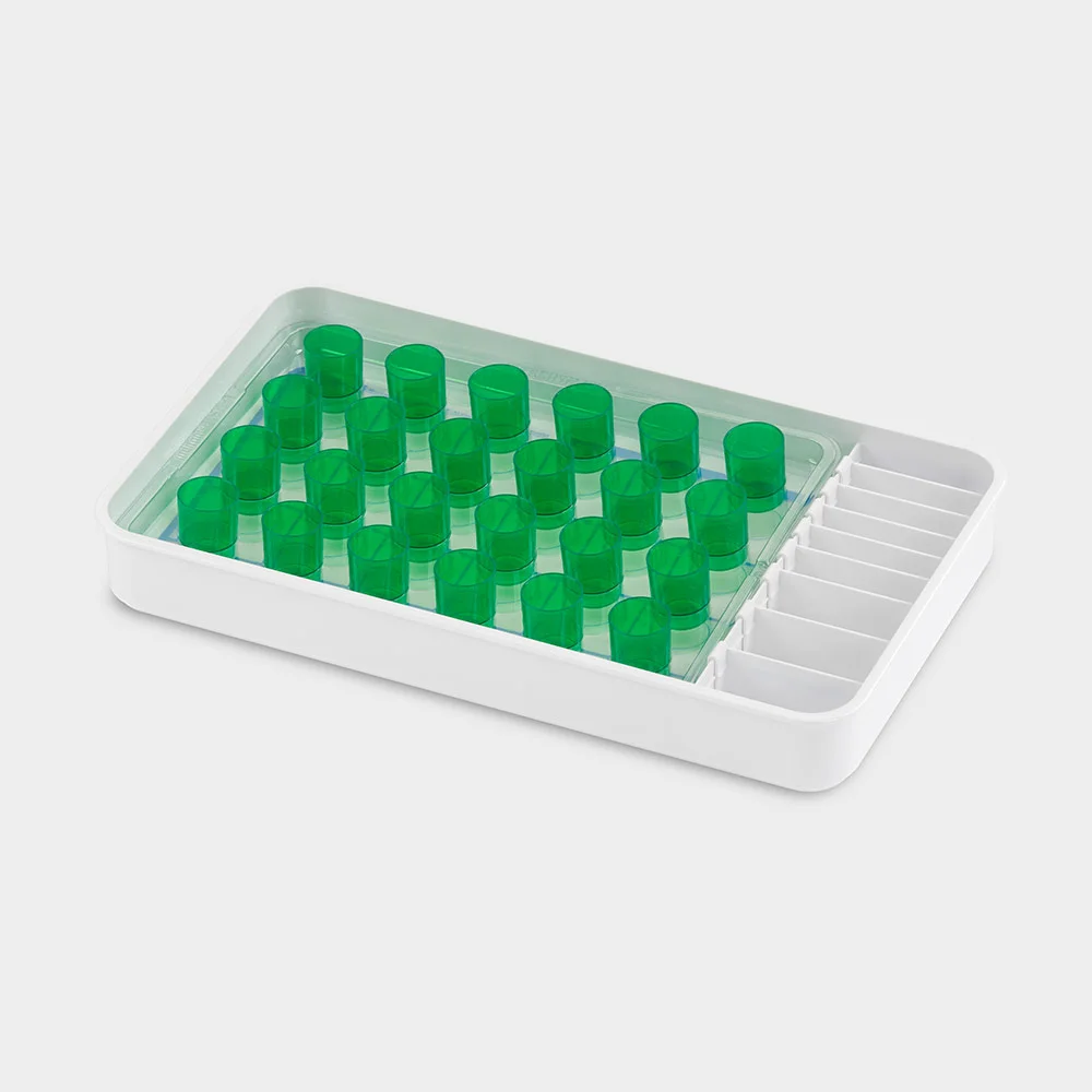 mit Tablett-Einsatz für 24 Becher Tabletten oder Tropfen und Pulver-Tütchen mit Beschriftungsfolie mit verschiebbarem Teilersystem und Folienstift Maße: L 433 x B 253 x H 55 mm