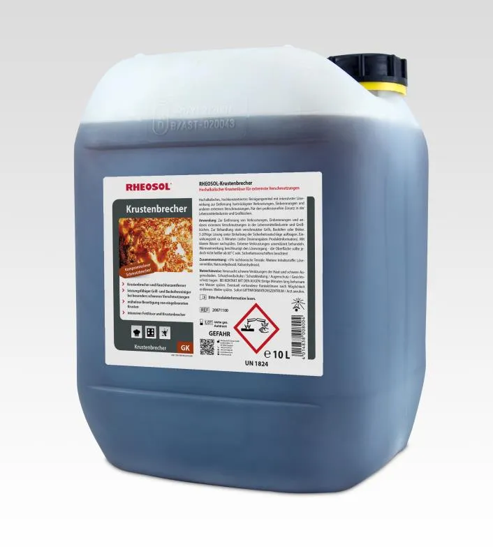 Krustenbrecher und Rauchharzentfernerleistungsfähiger Grill- und Backofenreiniger bei besonders schweren Verschmutzungenmühelose Beseitigung von eingebrannten Krusten intensiver Fettlöser und Krustenbrecherextrem starker Schmutzbrecher Hochalkalisches, hochkonzentriertes Reinigungsmittel mit intensivster Lösewirkung zurEntfernung hartnäckigster Verkrustungen, Einbrennungen und anderen extremen Verschmutzungen. Für den professionellen Einsatz in Lebensmittelindustrie und Großküchen. Anwendungsbereiche: Zur Entfernung von Verkrustungen, Einbrennungen und anderen extremen Verschmutzungen inLebensmittelindustrie und Großküchen. Zur Behandlung stark verschmutzter Grills, Backöfen oder Bräter. Anwendungshinweise: 5- 20 %ige Lösung unter Einhaltung der Sicherheitsratschläge auftragen. Einwirkungszeit ca. 5 Minuten. Mit klarem Wasser nachspülen. Extreme Verkrustungen unverdünnt behandeln. Wärmeeinwirkung beschleunigt den Lösevorgang; die Oberfläche sollte jedoch nicht heißer als 60°C sein. Sicherheitsvorschriften beachten!