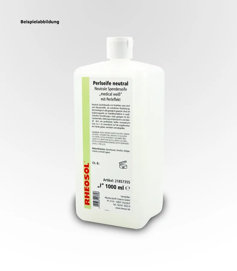 Die RHEOSOL Perlseife neutral ist eine Qualitätsseife mit Perleffekt. Aufgebaut ist die Seife auf einer natürlichen Rückfettung mit Hautschutz. Wegen der neutralen und hautschonenden Reinigung wird dieses Produkt gerne als Ergänzungsseife zur Handdesinfektion in medizinischen Einrichtungen genutzt. Auch ist die Perlseife hervorragend für Küchenbetriebe, die Nahrungsmittelindustrie sowie überall dort, wo parfümierte Seifen unerwünscht sind, geeignet.