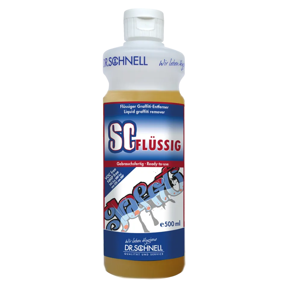 SC FLÜSSIG unverdünnt und gleichmäßig auftragen. Löseprozess überwachen._x000D_ Nach Einsetzen des Löseprozesses Graffiti ggf. mit geeigneter Mechanik bearbeiten. _x000D_ Gelöste Farbe sofort gründlich entfernen._x000D_ Als letzten Schritt gereinigte Fläche mit reichlich Wasser nachspülen._x000D_ Empfindliche Oberflächen wie z.B. Lacke nach der Reinigung mit saugfähigen Tüchern o. Ä. trocknen, um Schäden durch nachträgliches Einwirken des Reinigers zu vermeiden._x000D_ Arbeitsschritte wenn nötig wiederholen, bis das gewünschte Ergebnis erreicht ist._x000D_