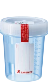 Schraubbecher, Sammlung und Lagerung von Urin, max. Arbeitsvolumen: 100 ml, (ØxH): 57 x 76 mm, Ø Öffnung: 62 mm, transparent, graduiert, Material: PP, Schraubverschluss, Verschluss: weiß, mit Sicherheitsetikett, Verschluss montiert, steril, 5 Stück/Beutel