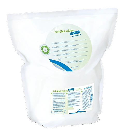 Trockene Tücher zur Tränkung mit Flächendesinfektionsmittel. Optimaler Schutz vor Kontamination durch die schülke wipes safe & easy.