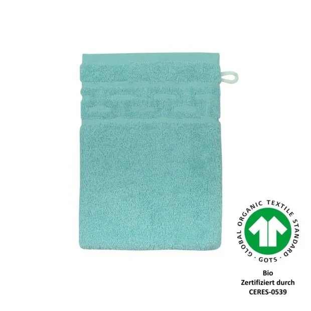Jacquard M GOTS aqua sky Waschhandschuh Größe 17/2Art.Nr.: 721649GTIN/EAN: 4016245701455Luxus-Qualität, 520 g/m², 100% Baumwolle aus kontrolliert biologischem Anbau, Jacquard-Bordüre Mäander, trocknerbeständig, verzieht nicht nach dem Waschen, 60° waschbar, GOTS zertifiziert, nachhaltig und umweltschonend hergestellt.